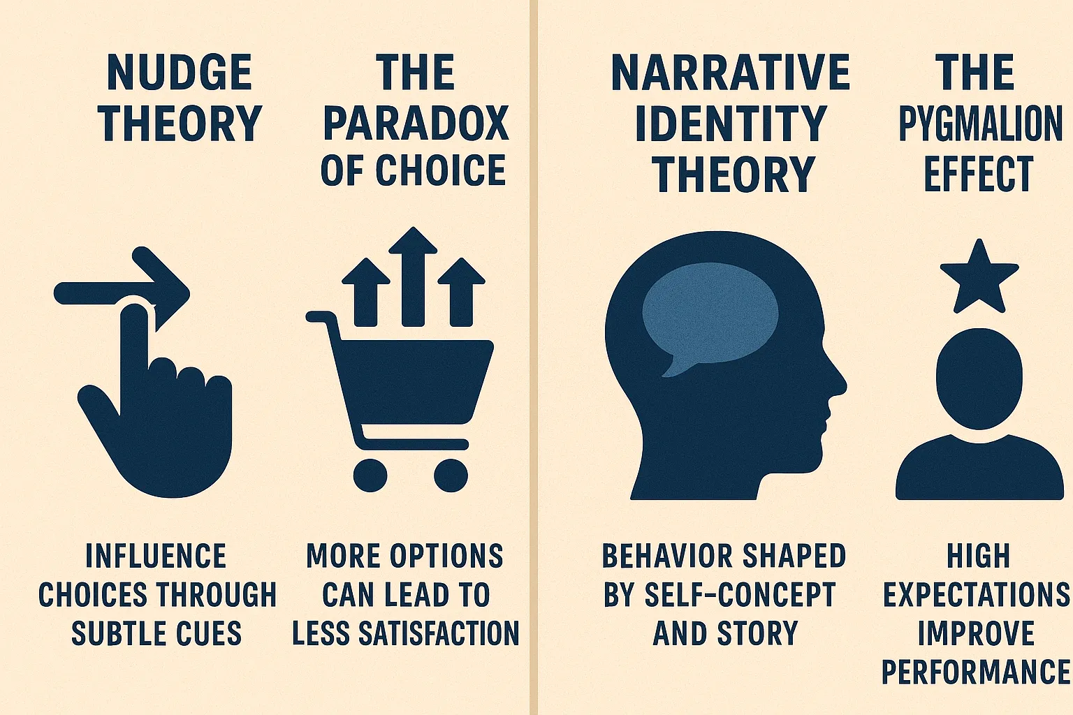 Several scholars have pioneered the study of how psychology drives economics, a field often called behavioral economics. The work of Richard Thaler, Cass Sunstein, George Akerlof, Rachel Kranton, and others demonstrates how deeply the human mind shapes markets, politics, and organizations. This article will explore some of the most influential theories: the Nudge Theory, the Paradox of Choice, the Narrative Identity Theory, and the Pygmalion Effect. We will then examine additional psychological phenomena that influence money and power, showing how economics is not just an abstract science but the art of controlling human behavior.